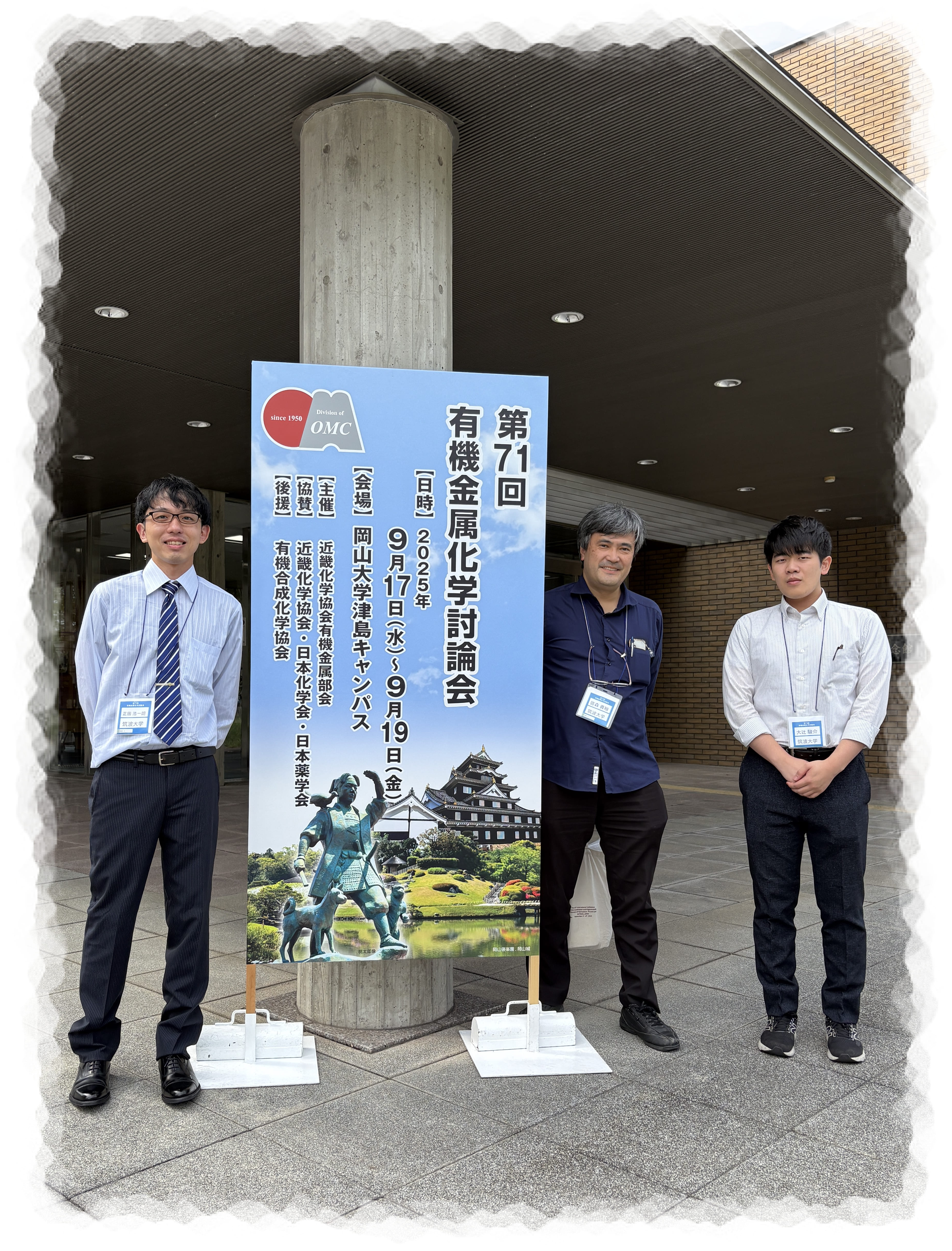 2025.9.17-19. | 第71回有機金属化学討論会(岡山大学)笹森教授・正田助教、参加。大辻駿介(M2)・ポスター発表。 |