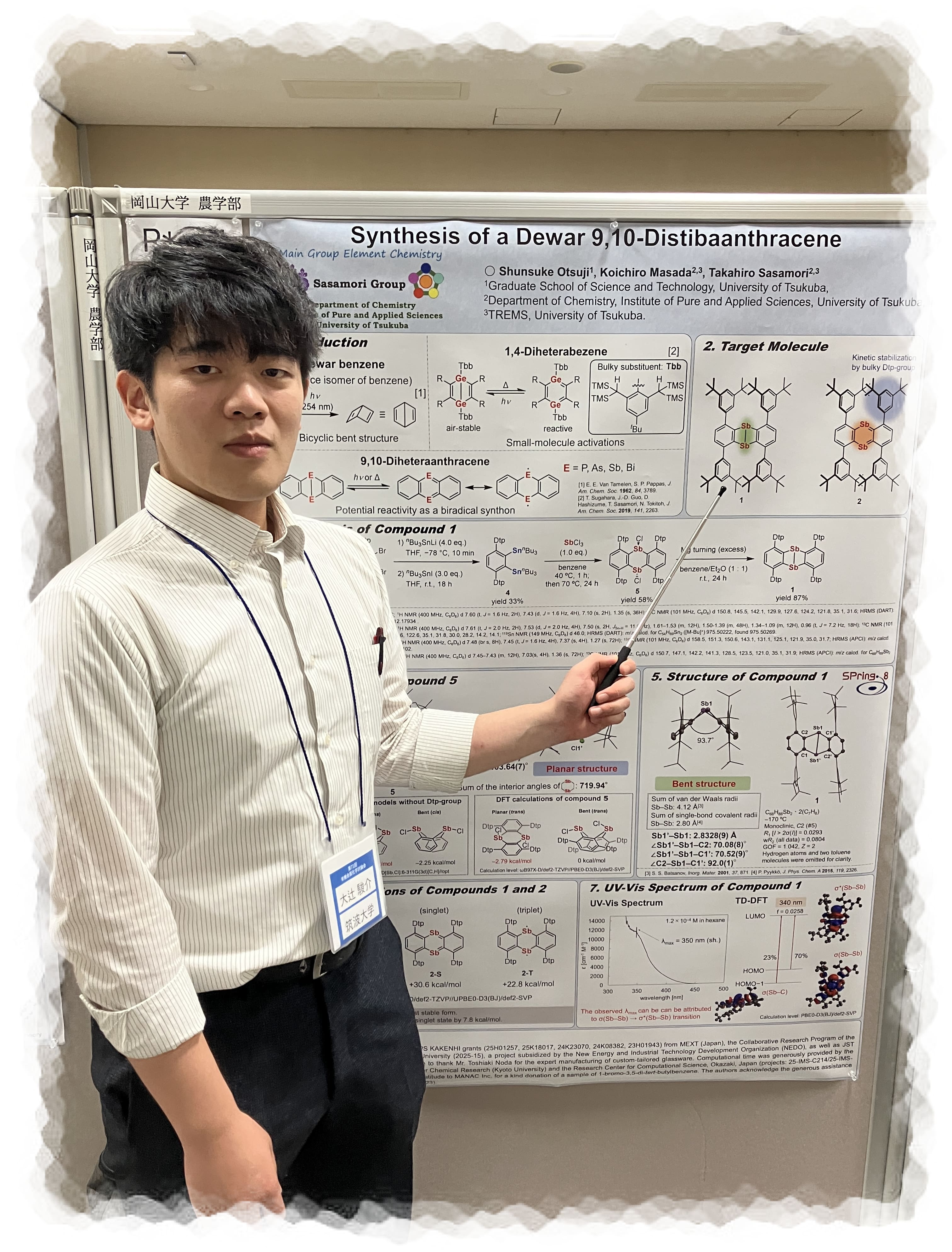 2025.7.8. | 【歓迎】International Main Group Element Chemistry Seminar 2025(IMECS-2025) 【感謝】第16回元素化学セミナー University of Murcia・Prof. Dr. Arturo Espinosa Ferao基調講演 【感謝】 岩本武明先生(東北大)・中田憲男先生(埼玉大)・斎藤雅一先生(埼玉大)・後藤敬先生(東京科学大)・山下誠先生(東京科学大)・小池太智先生(東京大)・太田圭先生(埼玉大)招待講演 韓子安(D2)・小林傑(D2)・安井智紀(D1)・浅川哲平(D1)・岩﨑龍樹(D1)・佐藤弘一(D1)・新井真由(M2)・大辻駿介(M2)・河本美怜(M2)・野元彬弘(M2)・浜野竜成(M2)・石浜亘(M1)・伊豆倉夢那(M1)・近藤颯汰(M1)・笠井瑞歩(M1)・田﨑秀悟(M1)・溝奏太(M1)・山田隼平(M1)ポスター発表 |