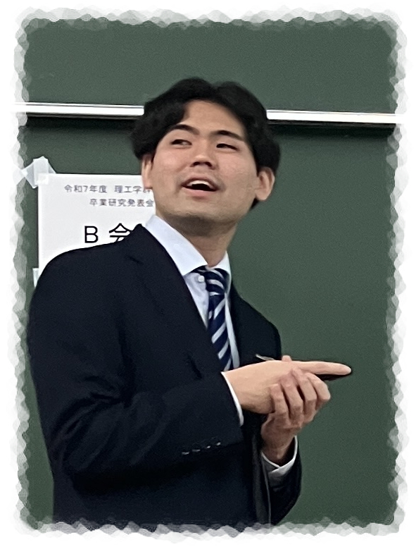 | 2025.2.5-6. | 修士論文発表会。安濟統瑚君(M2)、飯島慶介君(M2)、岩﨑龍樹君(M2)、薄羽慎之介君(M2)、加藤莉子さん(M2)、川元慎也君(M2)、佐藤弘一君(M2)、中村士竜君(M2)、王峻康君(M2)発表。お疲れさまでした! |