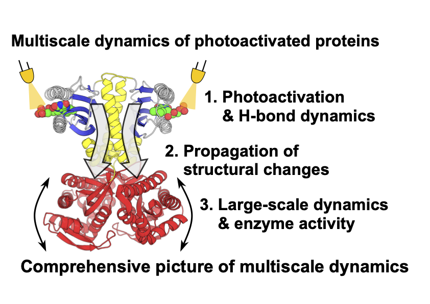 The conformational dynamics of proteins are essential for their functional expression. For example, OaPAC, which is one of the photoactivated proteins, drastically changes its activity upon light irradiation. During the photoactivation process, starting from tautomerization and hydrogen bond dynamics, conformational changes propagate, leading to large-scale conformational dynamics. Because the dynamics of photoactivated proteins involve elementary processes with various spatiotemporal scales, they are not well understood. We are developing novel methodologies to obtain a comprehensive picture of the multiscale dynamics.