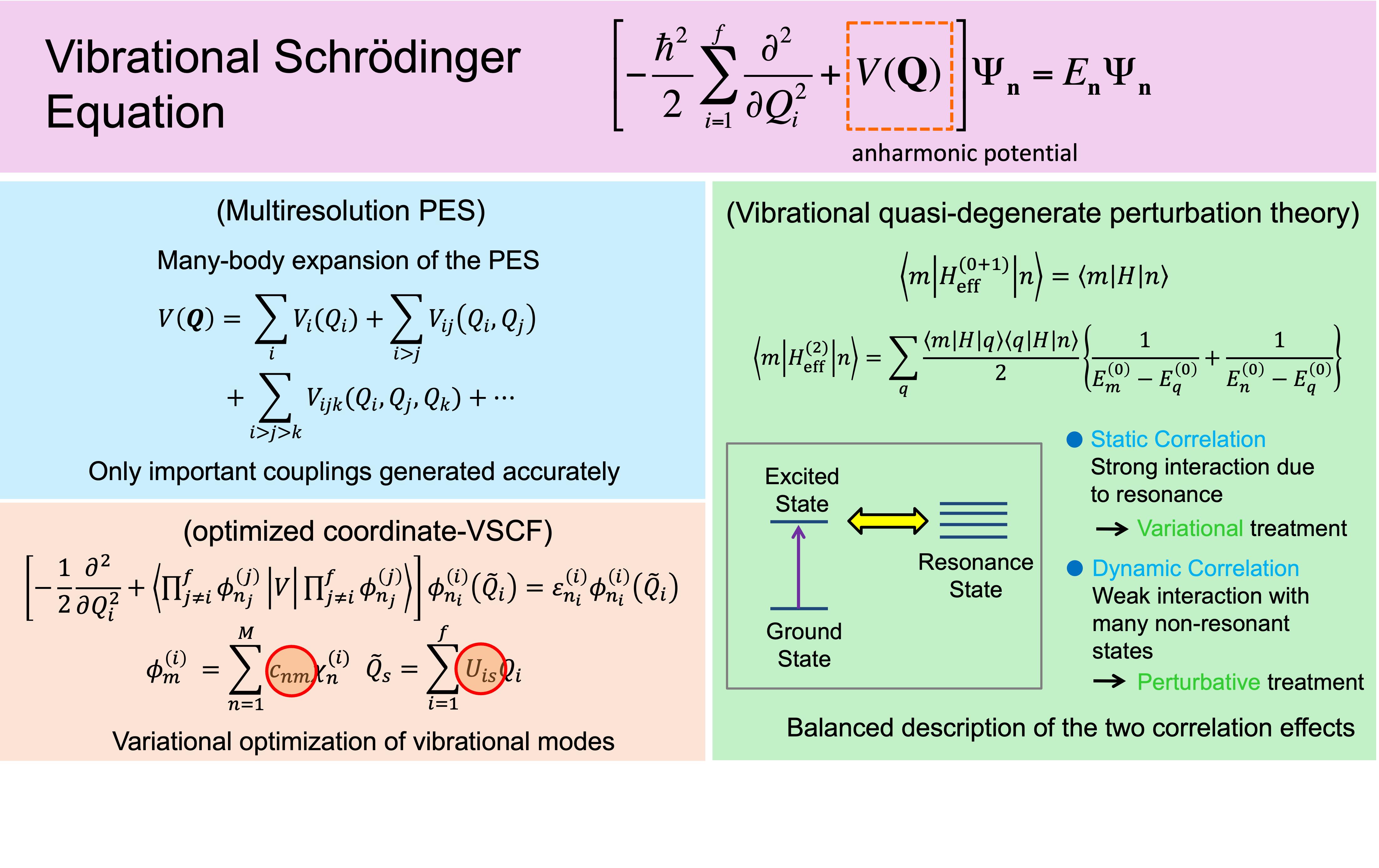 Molecular vibrational analysis is one of the most powerful methods for understanding complex molecular interactions at the atomic and molecular level. The vibrational states of molecules are described by the vibrational Schrödinger equation. However, one of the big challenges is that the computational cost of solving this equation grows prohibitive with the number of atoms. We have developed a multiresolution method to generate anharmonic potentials using quantum chemical calculations [1] and a vibrational quasi-degenerate perturbation theory (VQDPT) [2] to efficiently solve the vibrational Schrödinger equation. These methods implemented in our original program SINDO, and distributed as an open-source, free program. An advanced method to calculate the vibrational spectra of proteins and macromolecules is now in progress.