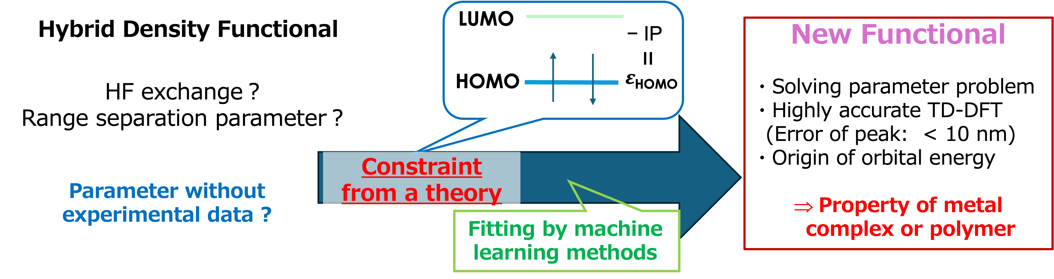 Artificial intelligence (AI) and machine learning have brought revolutionary advancements to scientific research. In 2024, the developers of Rosetta and AlphaFold were awarded the Nobel Prize in Chemistry for their breakthroughs in protein structure prediction. Similar to the challenges in protein structure analysis, density functional theory (DFT), which is widely used in quantum chemistry calculations, also faces numerous parameterization issues. In our laboratory, we have developed a methodology to determine parameters in theoretical constraints, independent of experimental data or high-level ab initio calculations [1]. This approach is further enhanced by combining it with machine learning-based fitting. We are currently developing processes to construct new functionals aimed at achieving higher accuracy.