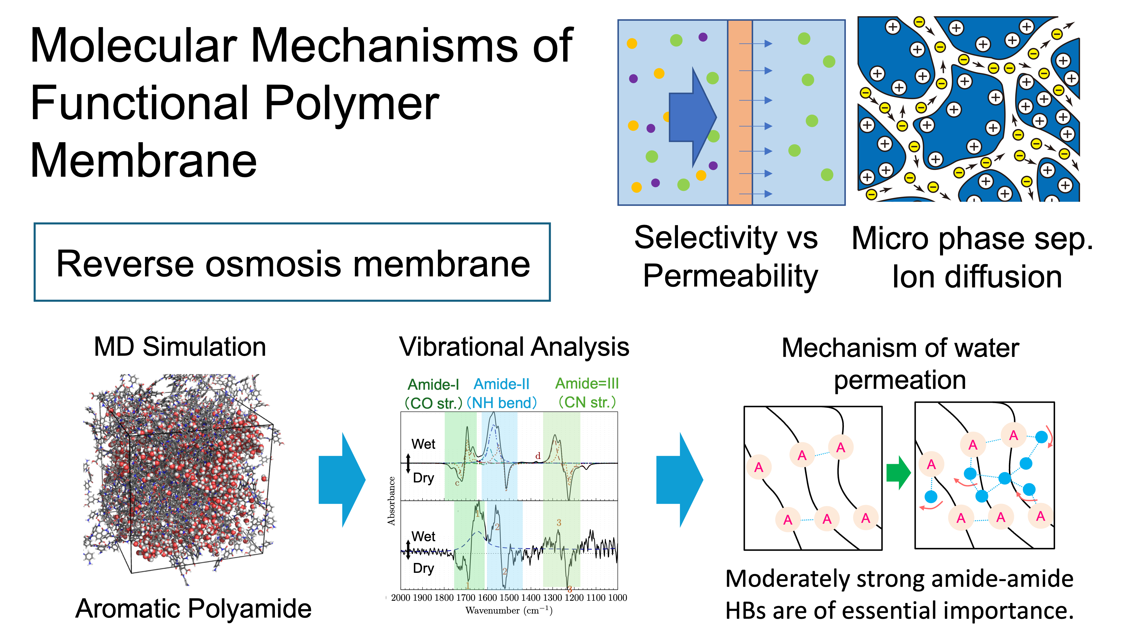 Functional polymer membranes, which selectively permeate and separate molecules and ions, are important materials for energy and environmental issues. The improvement of their performance requires an understanding of molecular mechanisms at atomistic levels. However, little is known about their key processes, namely, how the interfaces and amorphous portions of polymers are structured and how small molecules move in such an environment. We have utilized our original techniques, weighted average method and molecular vibration analysis, to elucidate the mechanism of water molecule permeation in reverse osmosis (RO) membranes [1]. Currently, research projects for ion exchange membranes and electrolyte membranes are in progress.