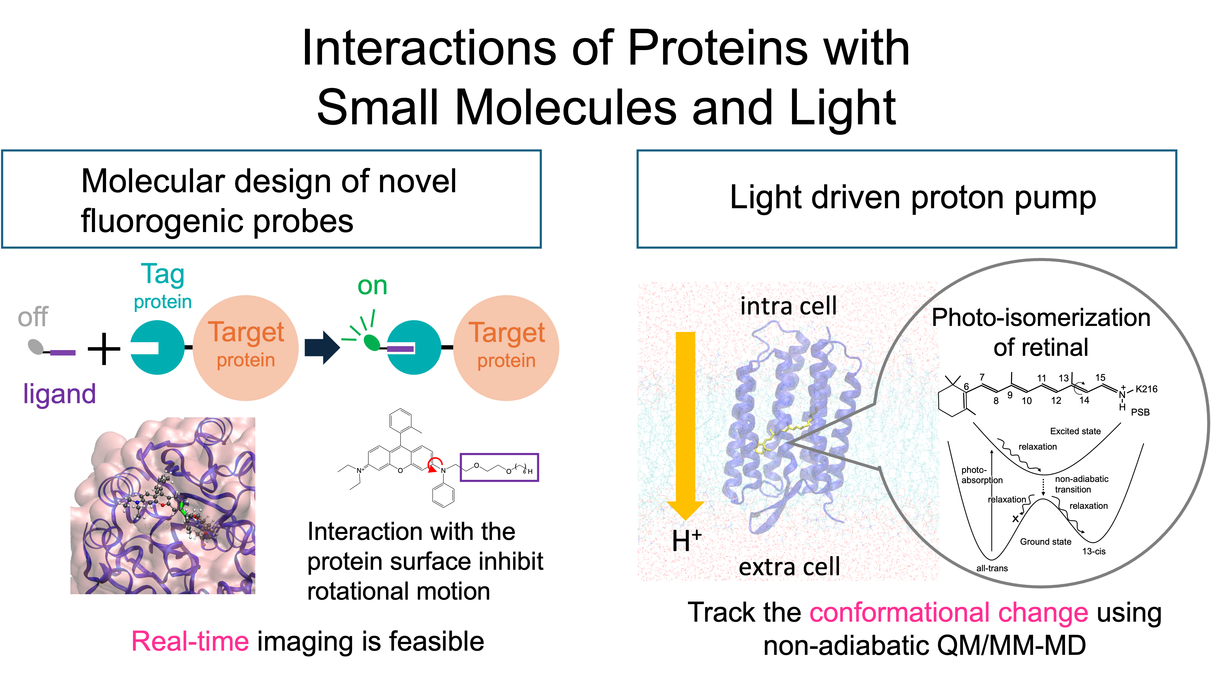Proteins achieve biological functions by undergoing various conformational changes in vivo. In many cases, the driving force is events such as binding of small molecules (substrates) and light absorption. We use QM/MM-MD calculations to track chemical reactions after substrate binding and/or photo-absorption and elucidate their molecular mechanisms. Recently, in collaboration with synthetic organic chemistry, we designed a fluorescent probe that undergoes photoemission only when it binds to a target protein [1]. Currently, further improvement is being explored by utilizing informatics tools. Projects on enzymatic reactions and light-driven proteins are now ongoing.