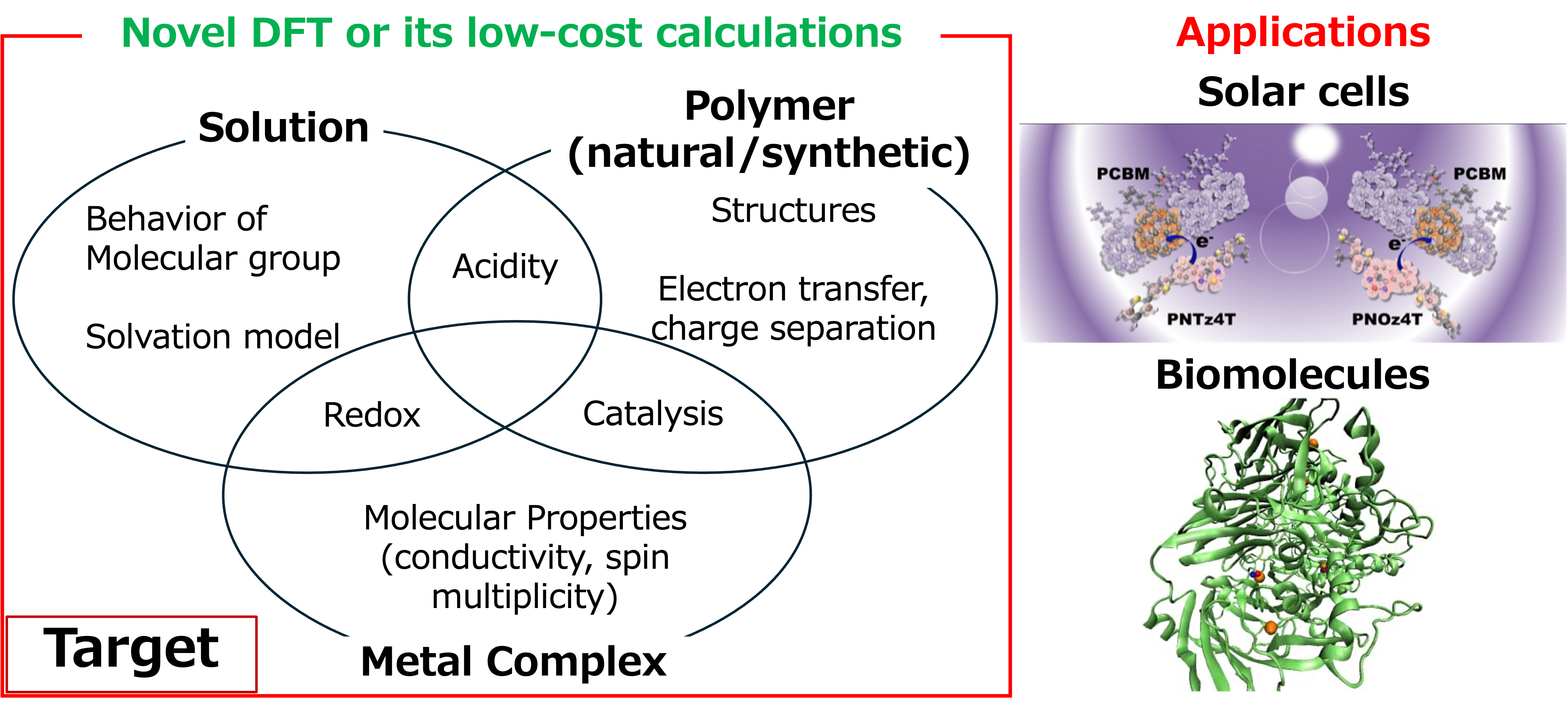 Our laboratory aims to predict the highly complex properties of materials, such as polymers and metal complexes, from the perspective of quantum chemistry calculations. For instance, in novel materials like organic light-emitting diodes (OLEDs) and organic thin-film solar cells, an accurate evaluation of charge-separated states is crucial for performance improvement. We have implemented density functional theory that describes charge-separated states and applied it to organic thin-film solar cell systems to analyze the likelihood of charge separation [1]. We have also computed and proposed electron transfer pathways for biological molecules based on pKa and redox potentials [2]. By accumulating these computational data, we aim to develop molecular generative AI in the future.