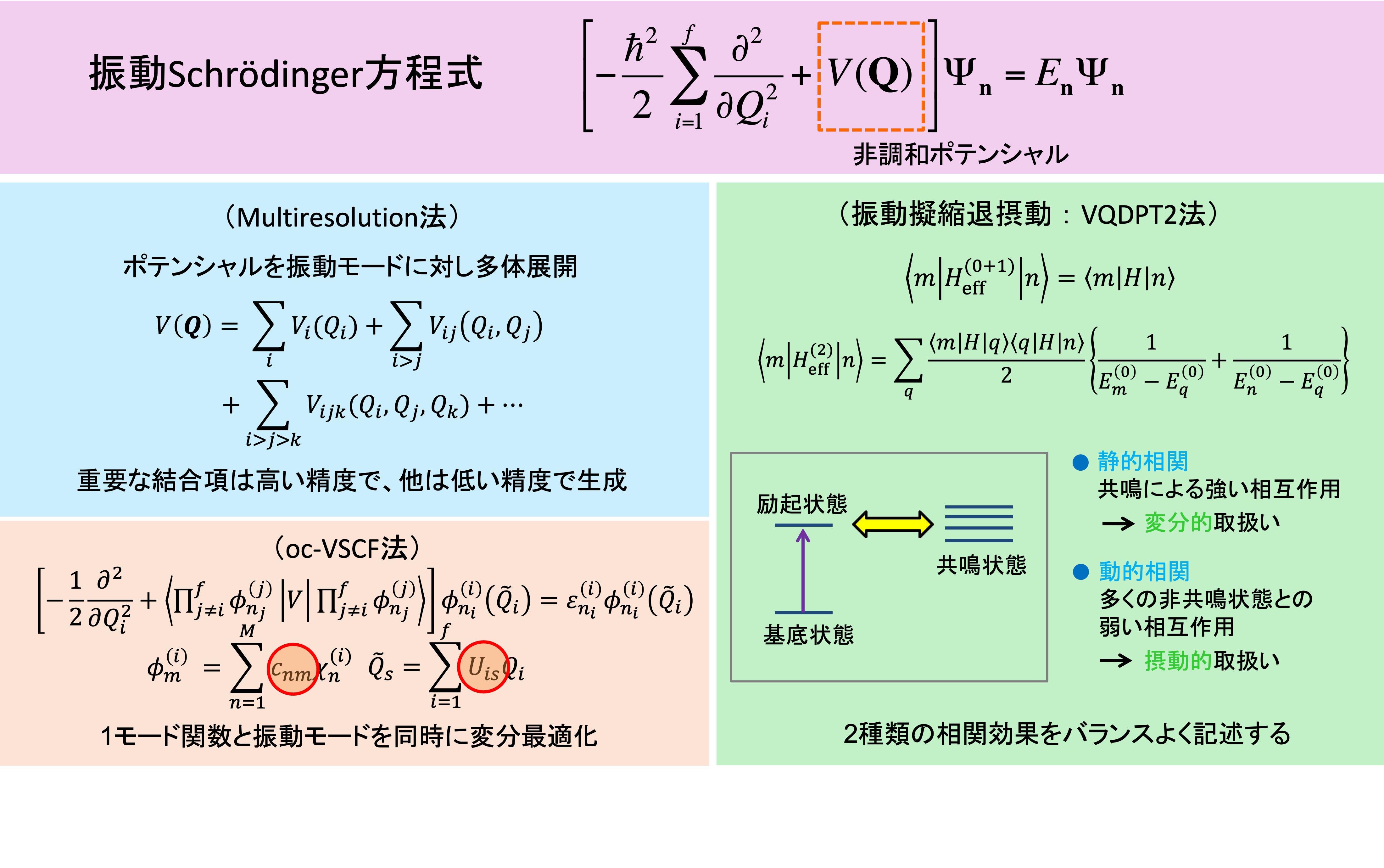 分子振動解析は複雑な分子の相互作用を原子・分子レベルで理解できる強力な方法の1つです。分子の振動状態は振動Schrödinger方程式で記述されますが、これを解く計算負荷は原子数とともに莫大になることが大きな課題です。私達は、非調和ポテンシャルを量子化学計算により生成するMultiresolution法[1]、振動Schrödinger方程式を効率よく解く振動擬縮退摂動論[2]などを開発し、独自のプログラムSINDO[3]に実装・公開しています。現在、タンパク質や高分子の振動スペクトルを計算する新しい手法開発が進行しています。