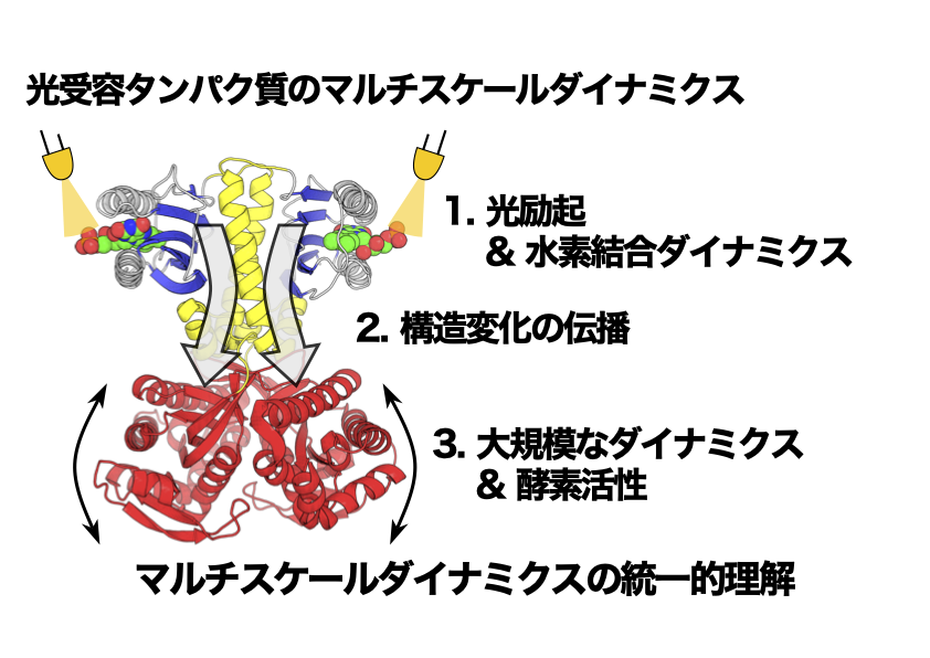 タンパク質の構造ダイナミクスは機能発現において重要です。例えば、光受容タンパク質の一種である OaPAC では光照射で引き起こされる構造ダイナミクスによって活性が大きく変化します。 OaPAC の光活性化においては、光励起による異性化と水素結合ダイナミクスから始まって、構造変化が伝播することによって最終的に大規模なダイナミクスを引き起こします。このように光受容タンパク質のダイナミクスは様々なスケールの素過程が関係しており、統一的な理解は困難です。我々はタンパク質の構造ダイナミクスを統一的に解明するべく新規手法の開発に取り組んでいます。