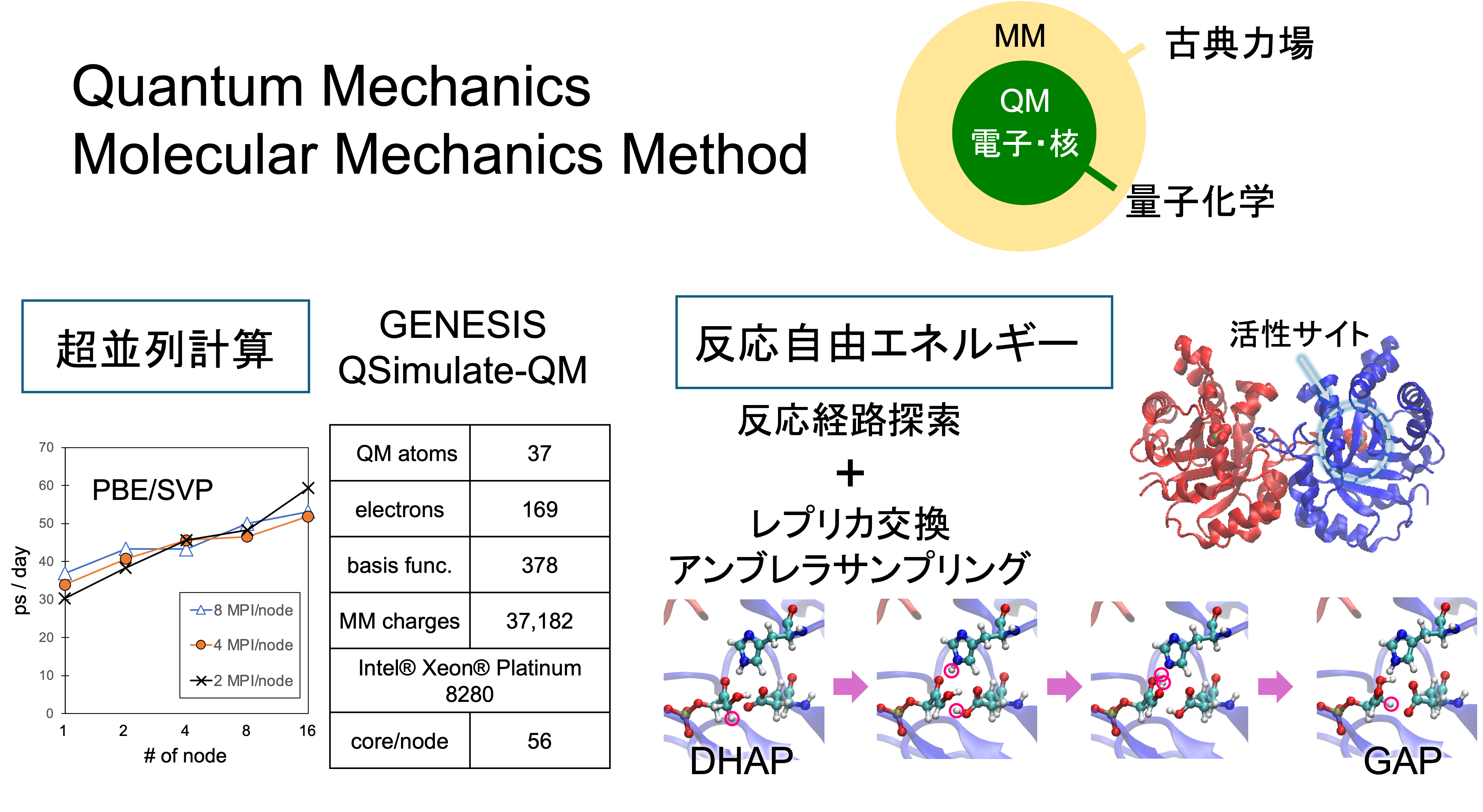 QM/MM法は、化学的に興味のある部分系を高精度な量子化学(QM)計算で扱い、溶媒や生体分子などの環境を低コストな古典力場(MM)計算で扱うマルチスケール法です。私達は、分子動力学(MD)計算プログラムGENESISにQM/MM法を実装し[1]、高い並列性を持つQSimulate-QMと融合することで、従来の10倍以上の高速なQM/MM-MD計算を達成しました[2]。現在、QM/MM法と拡張アンサンブル法を組み合わせた効率的な自由エネルギー計算法の開発が進んでいます。