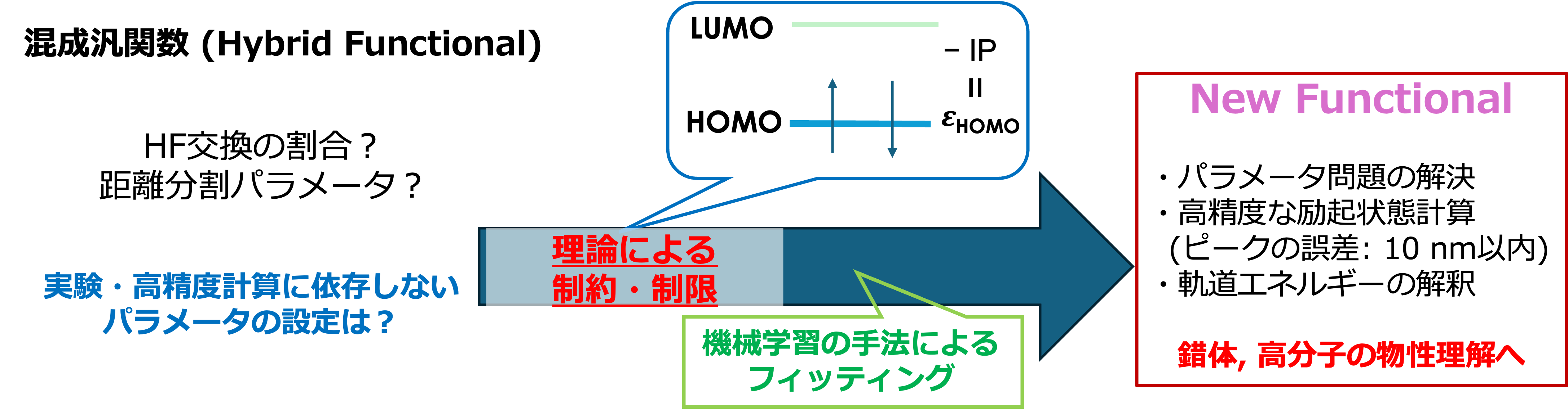 人工知能や機械学習は科学研究に革新をもたらし、2024年にはRosettaやAlphaFoldの開発者らがノーベル化学賞を受賞しました。これは、AI技術がタンパク質構造解析などの難問を飛躍的に進展させた成果です。量子化学計算で広く用いられる密度汎関数理論においても、タンパク質構造の予測と同様に多くのパラメータ問題が存在します。本研究室では、理論的な制約を基盤として実験や高精度計算に依存しないパラメータを決定し、さらに機械学習によるフィッティングを組み合わせた手法を開発しました[1]。現在、更なる高精度化を目指して新たな汎関数を構築するプロセスを開発しています。