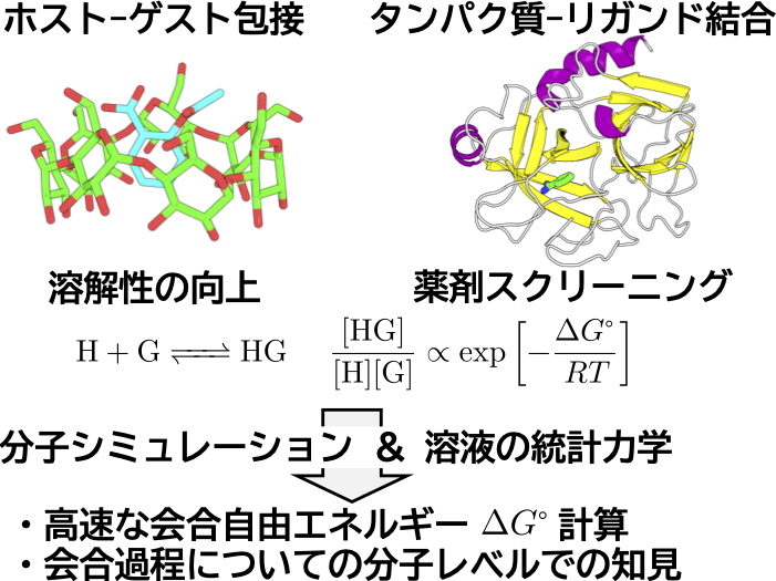 ホスト–ゲスト包接過程やタンパク質–リガンド結合などに代表される分子会合過程は様々な分野で重要です。例えば、𝛽-cyclodextrin をホストとして用いることで様々な分子の溶解性を向上させることが可能です。また、薬剤設計においてはターゲットとするタンパク質と薬剤分子の会合安定性(会合自由エネルギー)が重要な要素であり、分子シミュレーションを用いた高速なスクリーニングが期待されています。しかしながら、自由エネルギー計算は非常に計算負荷が高く、生体分子系のような複雑な系で自由エネルギー計算を行うことは困難です。我々は分子シミュレーションだけではなく、溶液統計力学に基づいて低計算負荷で会合自由エネルギーを算出可能な方法論の開発を行っています[1]。今後は開発した方法を実際のタンパク質–薬剤分子系に適用し、会合過程について分子レベルでの知見を得ることを目指しています。