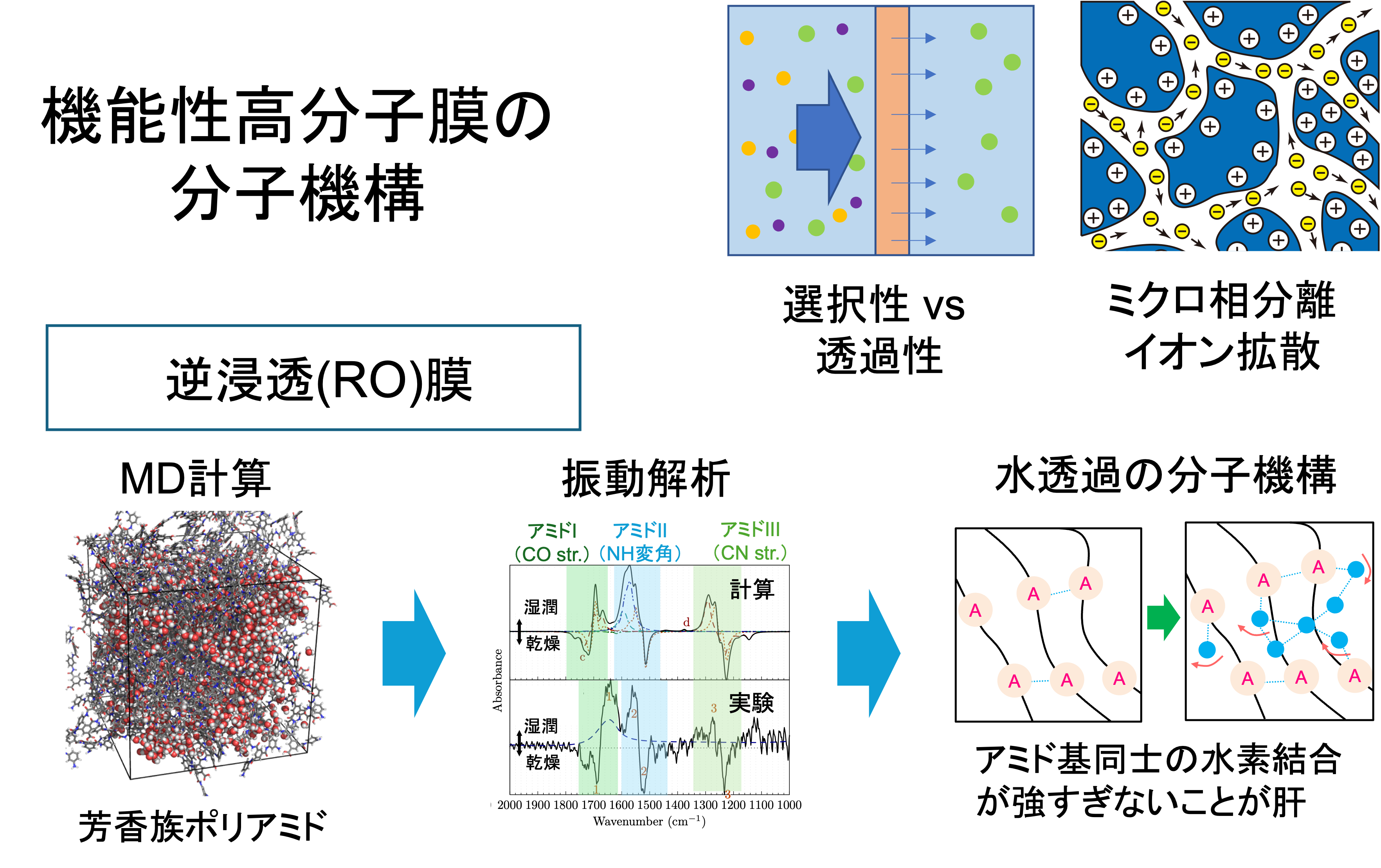 分子やイオンを選択的に透過・分離する機能性高分子膜は、水ろ過や電解質膜など様々な用途に利用されており、エネルギー・環境問題で重要な材料です。その性能向上には分子機構に対する理解が必須です。つまり、高分子の界面やアモルファス部分がどのような構造をしているのか、また、そのような環境で小分子がどのように運動するのかを知ることが鍵ですが、その詳細はよく分かっていません。私達は、独自の技術である重み平均法と分子振動解析を駆使し、逆浸透(RO)膜中の水分子透過機構を明らかにしました[1,2]。現在、イオン交換膜や電解質膜を対象とした研究が進んでいます。