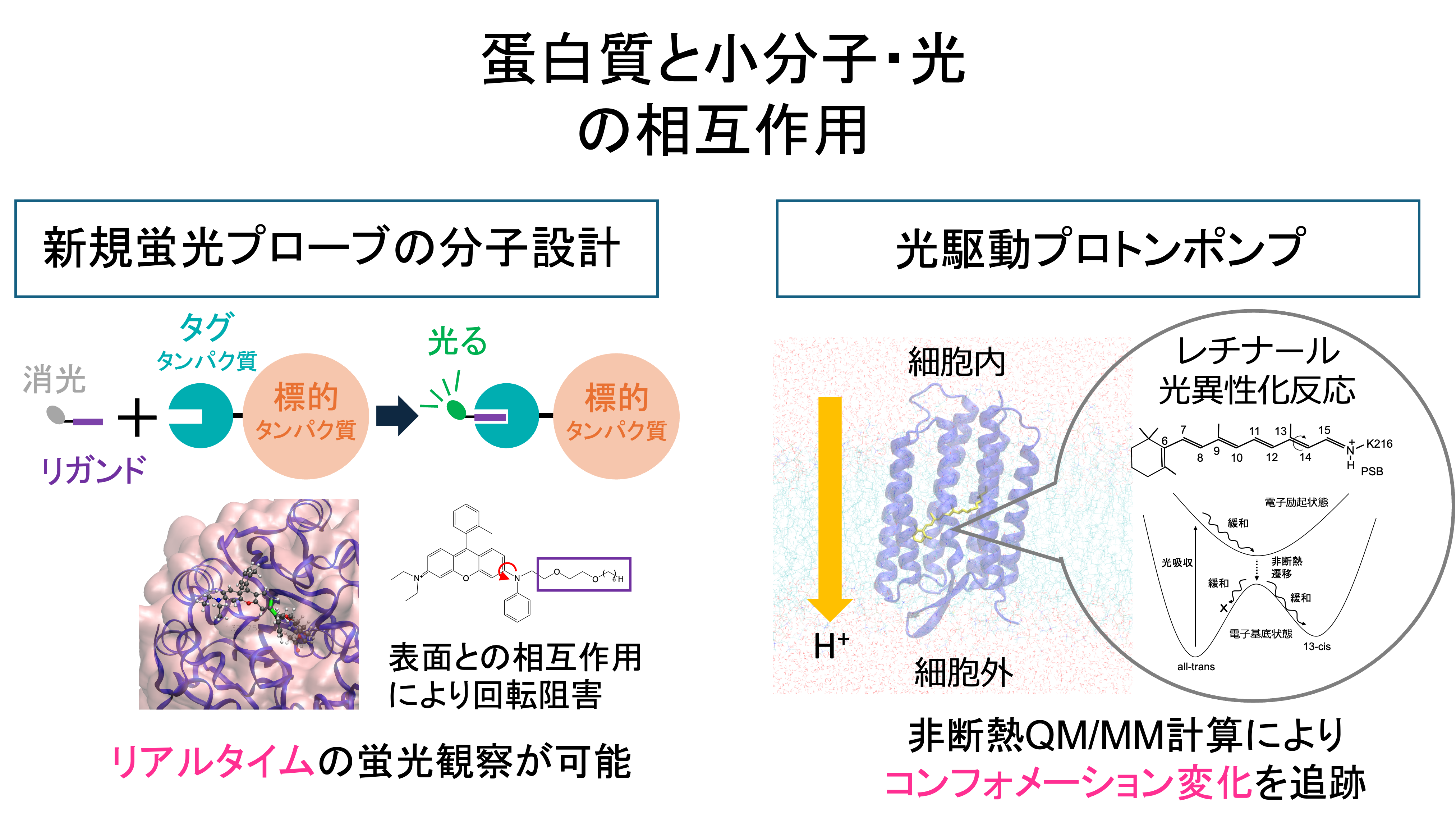 蛋白質は、生体内で様々なコンフォメーション変化を起こすことで、生命活動に必要な機能を達成しています。多くの場合、その駆動力となっているのは小分子(基質)の結合や光吸収のようなイベントです。私達は、QM/MM-MD計算を用いて、基質結合や光吸収後の化学反応を追跡し、その分子機構を解明します。最近、有機合成化学と共同し、標的蛋白質を認識・結合した時にのみ光る蛍光プローブを設計しました[1]。さらに、情報科学的ツールを駆使し、蛍光プローブの高度化に取り組んでいます。現在、酵素反応や光駆動蛋白質への応用が進んでいます。