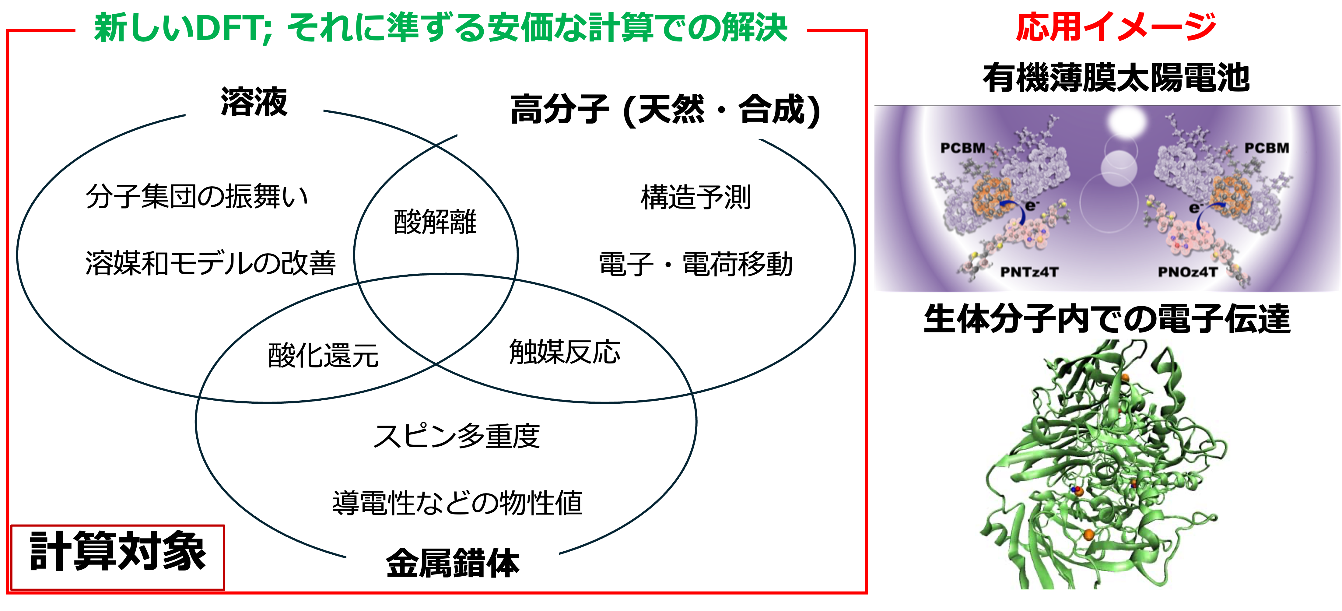 当研究室では、高分子・金属錯体を対象に、量子化学計算の立場から複合的な物質の性質の予測を目指しています。例えば、有機発光ダイオードや有機薄膜太陽電池などの新規材料では、性能発現に関わる電荷分離状態の正確な評価が不可欠です。私たちは、電荷分離状態を記述する密度汎関数理論を実装し、有機薄膜太陽電池系に適用して電荷分離の起こりやすさを解析しました[1]。さらに、酸解離定数や酸化還元電位を基に生体系分子の電子移動経路を計算し、提案しています[2]。これらの計算データの集積を進めることで、将来的には分子生成AIの構築を目指しています。